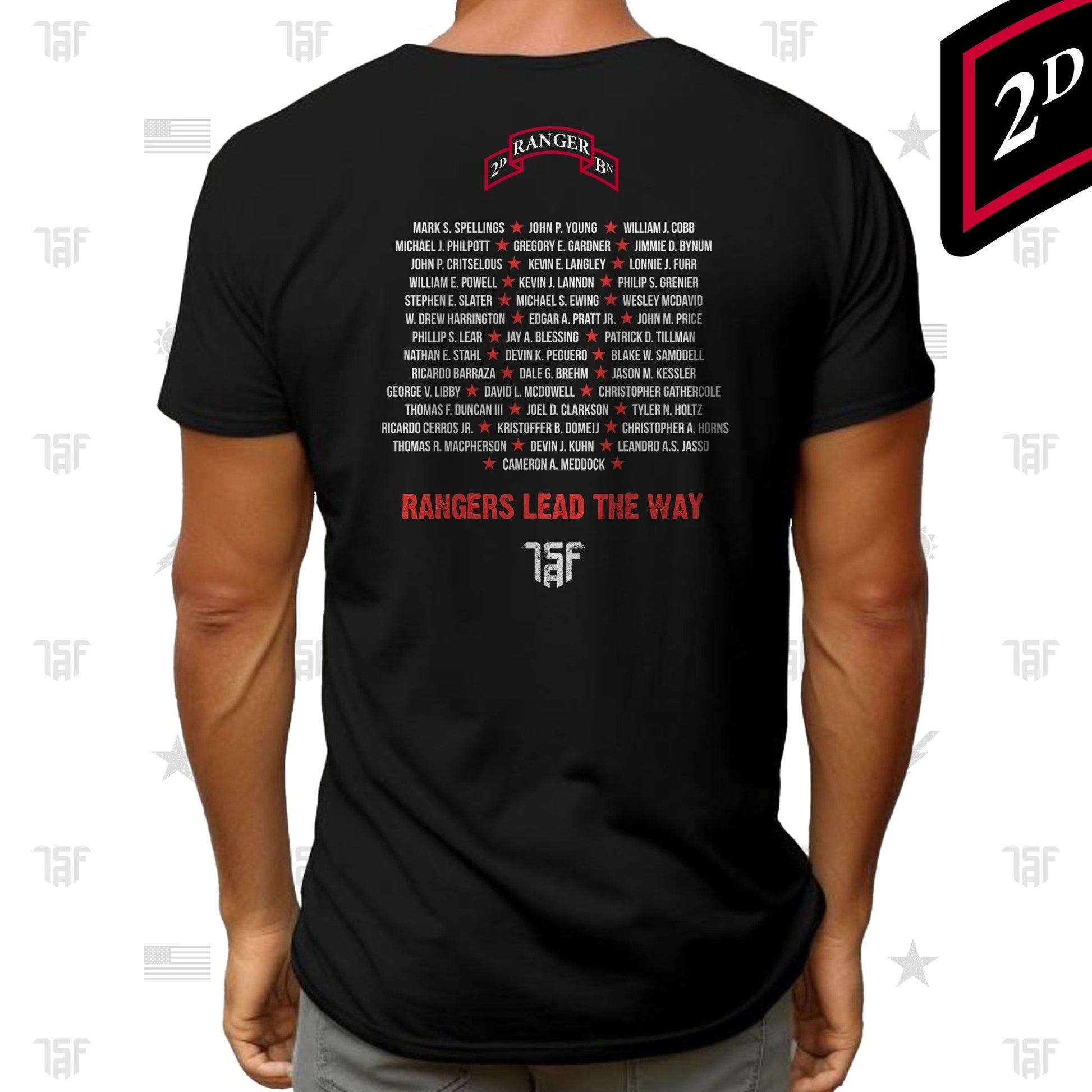 2nd Ranger Battalion memorial detailing the names of all fallen comrades who were lost in action or in training. For the Airborne Ranger in the sky. Made from 100% cotton, with an athletic fit.