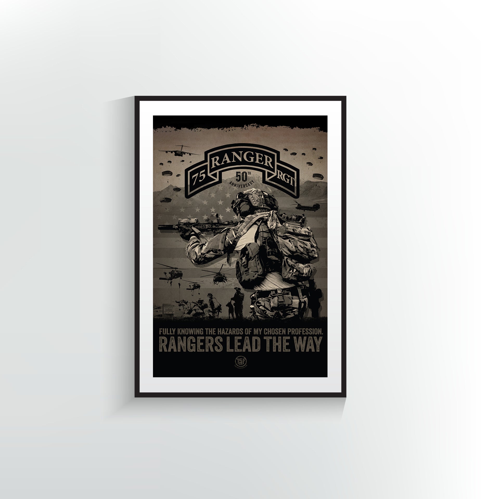 Special Edition 50th Anniversary of the 75th Ranger Regiment. Made with museum-grade paper (175gsm fine art paper). Available in multiple sizes, each poster is printed with top-tier pigmented archival inks for a stunning end result.