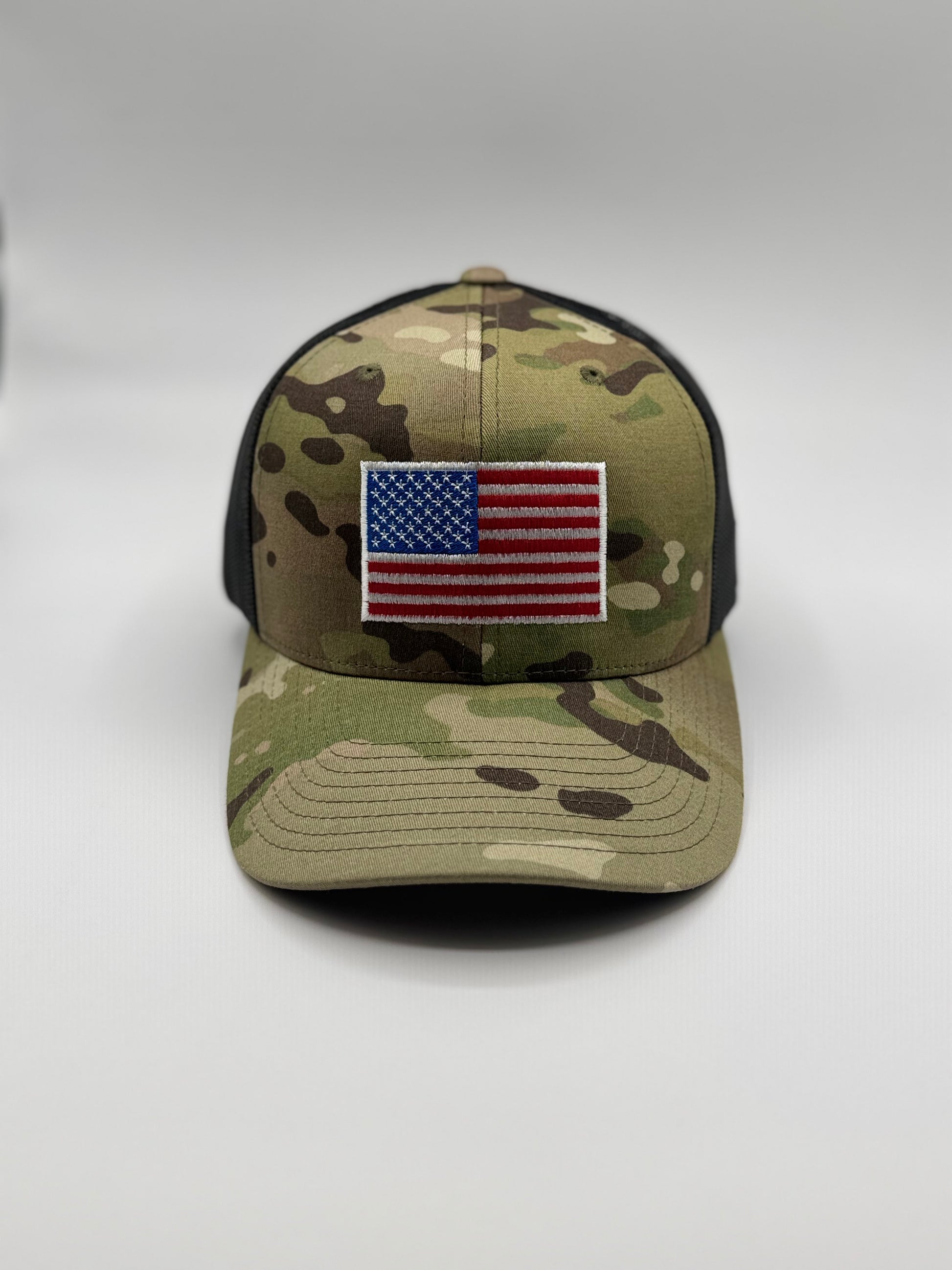 Old Glory Multi-cam trucker hat is a comfortable classic, perfect for casual wear. This hat features an embroidered American Flag in the front, Black mesh back, snap-back closure, and TSAF pre-woven label on the side.