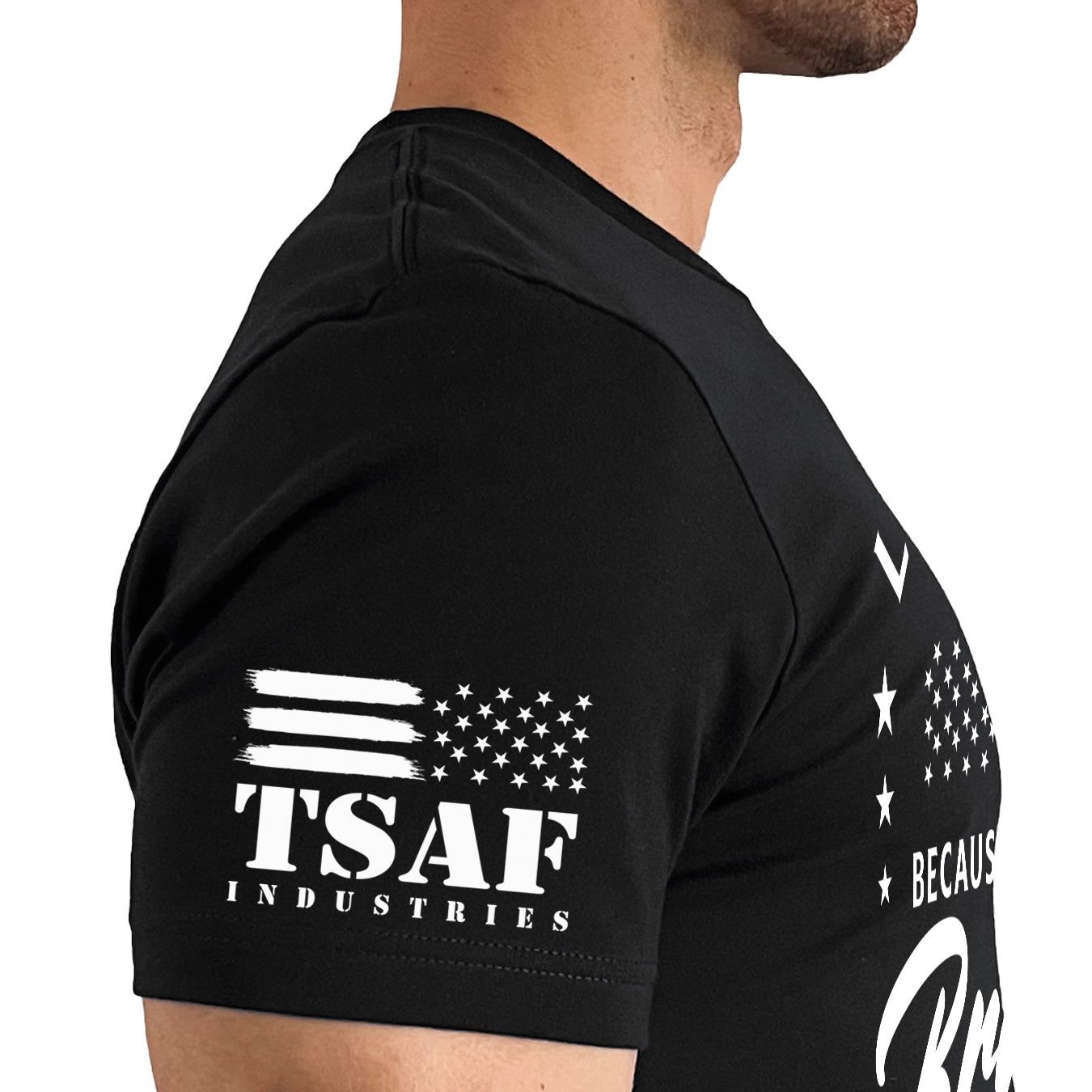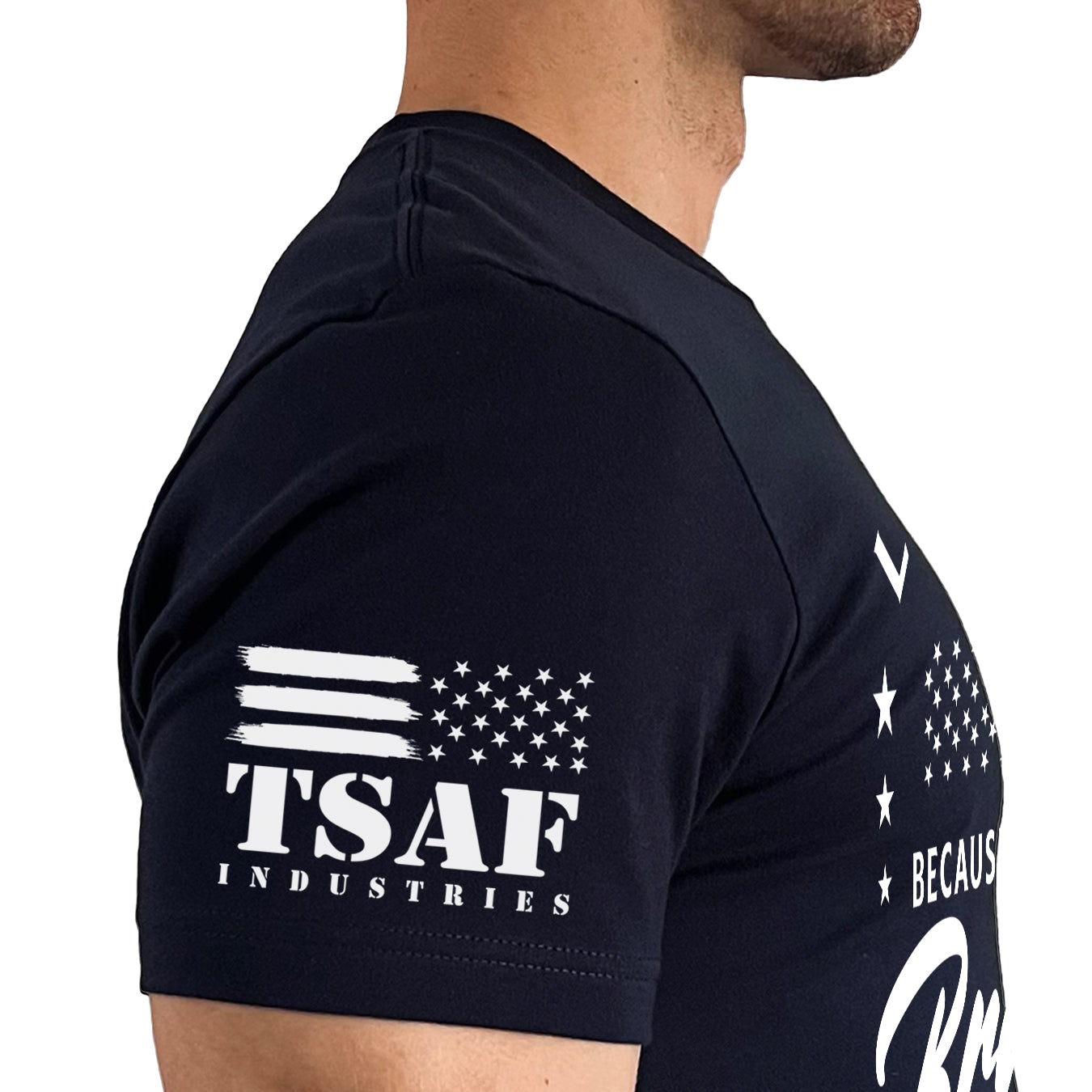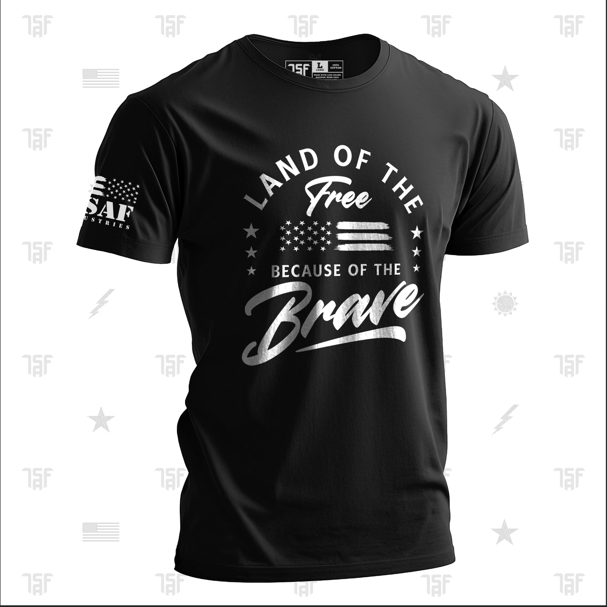 A tribute to military veterans and patriots, featuring the statement "Land of the Free, because of the Brave." Crafted from 100% cotton for comfort and durability, the design includes a TSAF logo and stylized American flag on the sleeve. Wear it loud, wear it proud - because freedom isn't free.